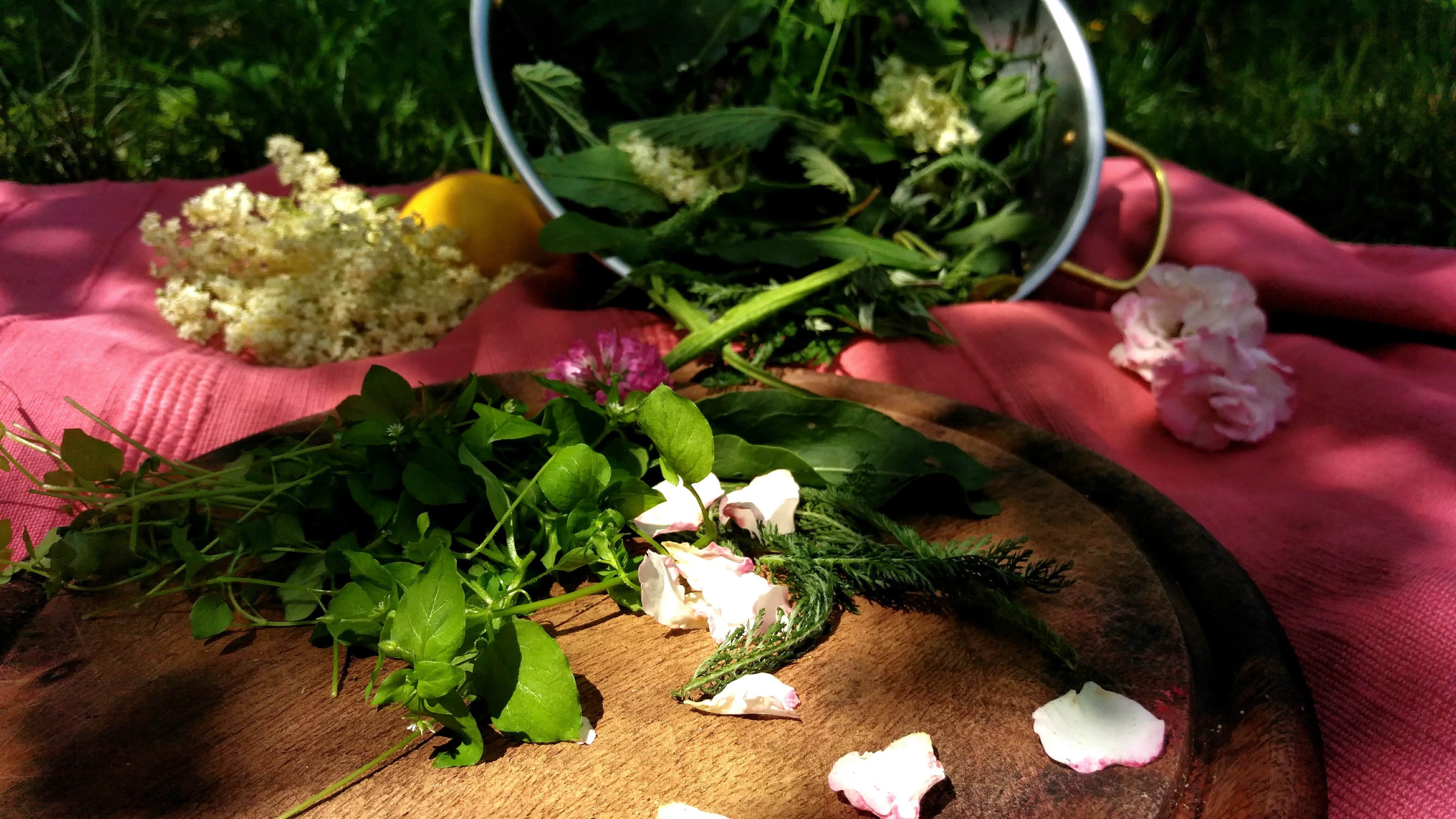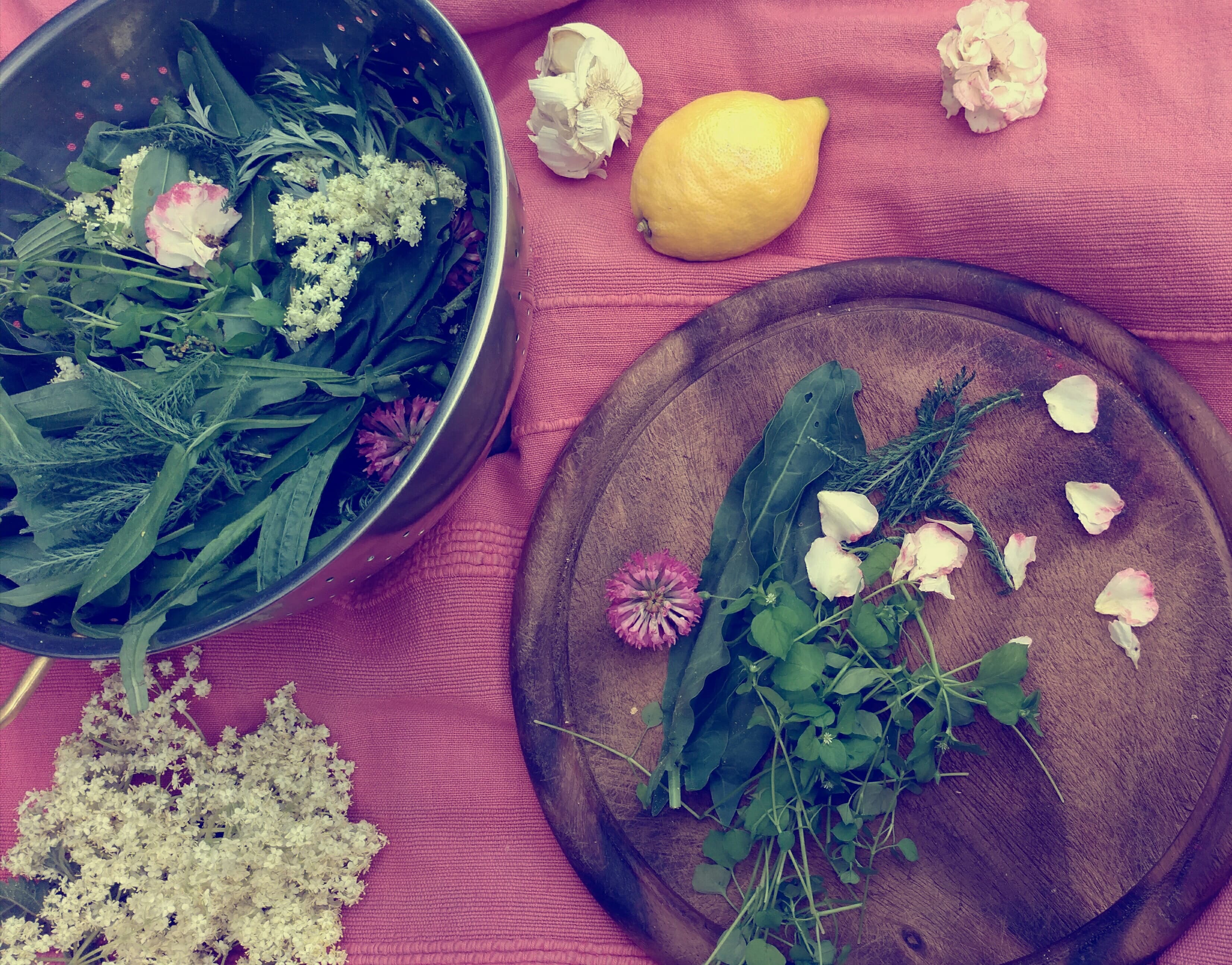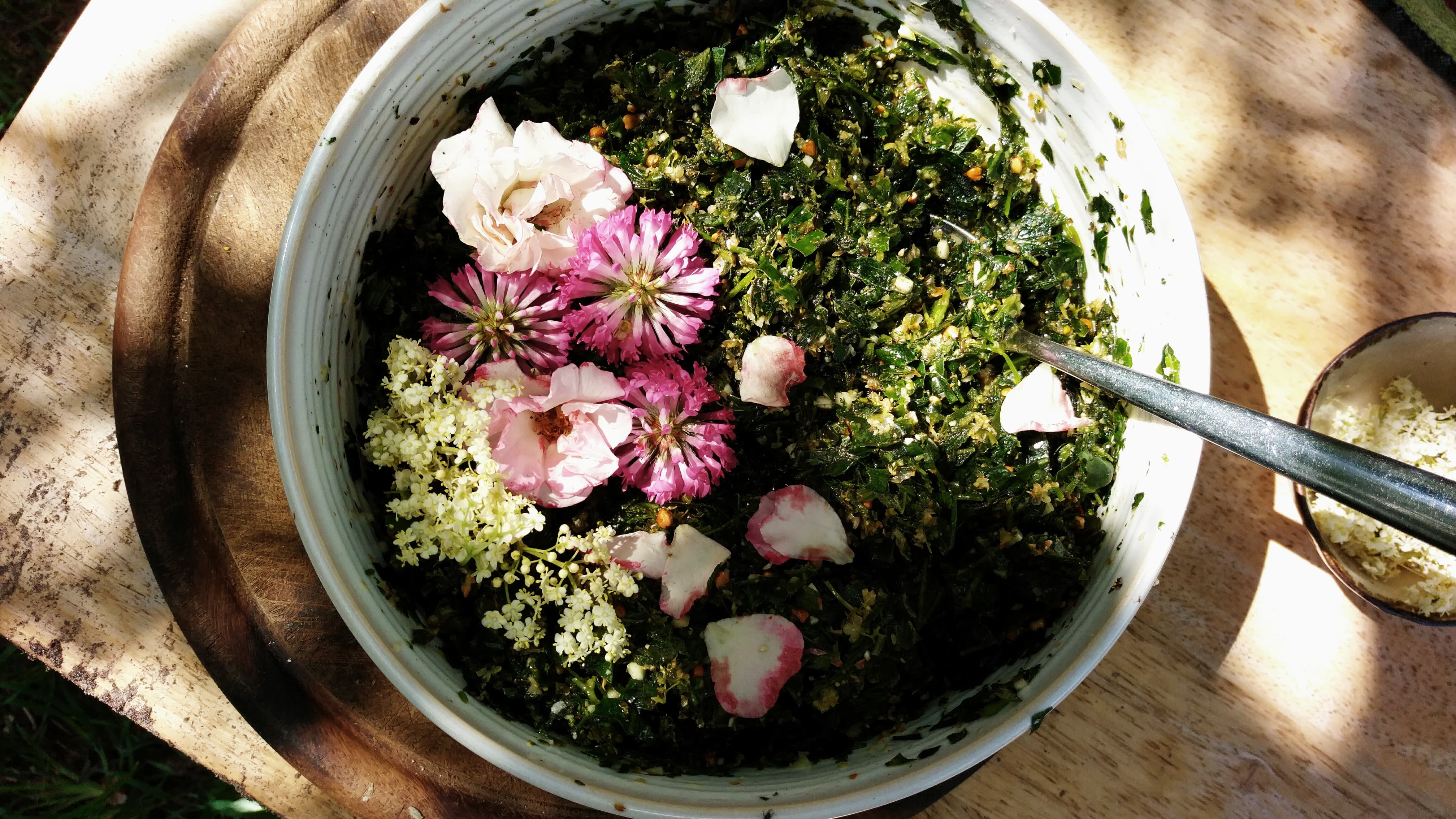 Wilde Kräuter finden wir überall. Sie sind voller guter Sachen und so lecker. Ich mache gerne ein Pesto aus allem was ich in meiner Umgebung finden kann. Die Kräuter hacke ich per Hand, so ist es ein grobes Pesto für noch mehr Geschmack. Mit gerösteten Kernen, etwas Zitrone und natürlich viel Olivenöl passt es super zu Kartoffeln, auf dem Brot oder als Topping für Salate und Suppen.